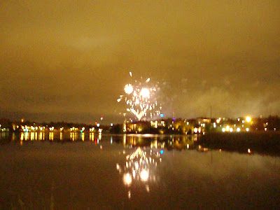 On Sunday I went to Töölönlahti with my girlfriend to see the fireworks. A good choice, as it was the perfect spot to enjoy the short but beautiful spectacular. Taking pictures wasn´t easy but I´ll include one here anyway. I like the reflections on the bay and the way the explosions look just like a firey grimace.